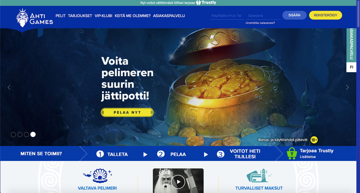 AHTI Games Kasino sallii pelaamisen ilman rekisteröitymistä Trustly-palvelun kautta helposti suomalaisten verkkopankkitunnuksien avulla. Tällä operaattorilla on myös tarjolla erittäin laaja määrä muitakin maksutapoja, jotka pitävät talletuksille sisällään mm. Visan, Mastercard-luottokortin, Skrillin, Netellerin, Payzin, Zimplerin sekä Sofortin. Mukaan mahtuu myös paljon muita menetelmiä, ja kasinolle on nostettava hattua vaihtoehtojen runsaudesta.