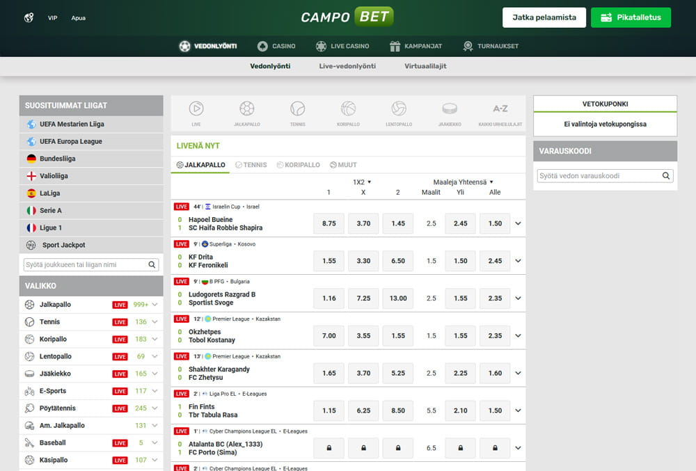 CampoBet-vedonlyönti tarjoaa valikoimaa vaikka millä mitoin. Mukana on suosittujen liigojen, kuten NHL:n ja Mestarien Liigan, lisäksi myös pienempiä liigoja. Täällä pääset myös lyömään vetoa kaikista ajankohtaisista urheilutapahtumista. Tavallisen urheilun lisäksi sivusto on kunnostautunut myös e-uhreilun saralla, ja myös siltä puolelta löytyy runsaasti lajeja ja valikoimaa.