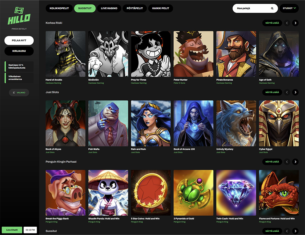 Hillo kasino on suunniteltu selkeäksi ja helppokäyttöiseksi, joten navigointi on vaivatonta alusta loppuun. Etusivulla näkyvät selkeästi eri pelikategoriat, ja pelien suodatus onnistuu helposti esimerkiksi pelityypin, uutuuden tai suosituimpien pelien mukaan. Kaikki tärkeä löytyy joko sivuston vasemman reunan valikosta tai etusivun alalaidan linkeistä.