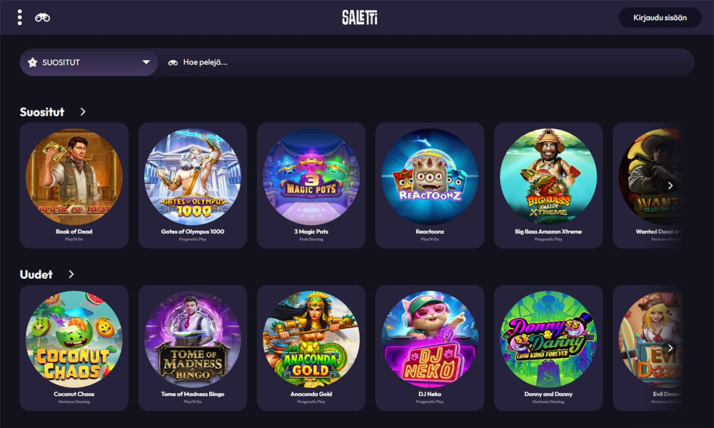 Kasino panostaa pelivalikoimansa monipuolisuuteen yhdistämällä tuhansia kolikkopelejä, pöytäpelejä ja laajan live-kasinon saman katon alle. Pelit tulevat tunnetuilta toimittajilta kuten NetEnt, Yggdrasil ja Pragmatic Play. Live-kasinon puolella on valittavana monia klassisia pelejä, kuten blackjackia, baccaratia ja game show -tyyppisiä vaihtoehtoja. Saletti-kokemuksia vauhdittaa uuden pelaajan tervetulobonus sekä aktiivisille pelaajille suunnattu VIP-ohjelma.