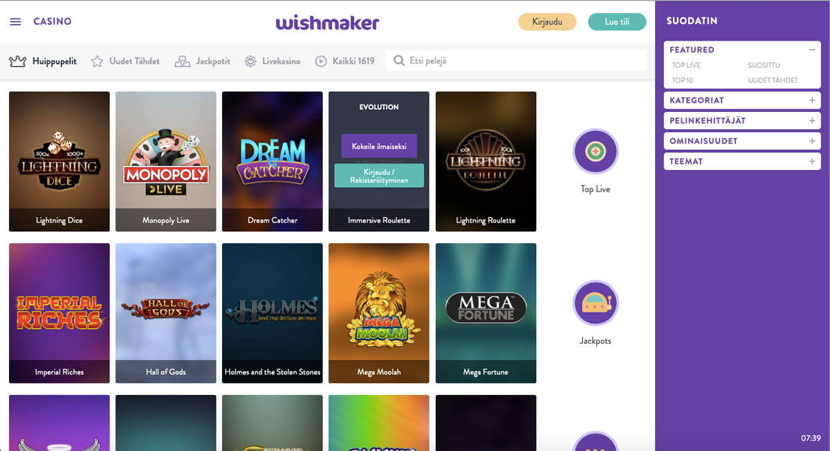 Valikoimasta löytyy niin rulettia, baccarattia kuin myös blackjackia. Mukaan on otettu niin ollen myös moderneja pelejä kuten monopoli sekä Dream Catcher, ja monia muita. Live osuuden aidot jakajat sekä laadukas video striimi luovat todellista kasino tunnelmaa. Tämä on ansainnut paikkansa parhaiden livekasinoiden kärkipäästä. Wishmaker tarjoaa upean kattauksen, jonka joukosta jokainen asiakas löytää varmasti jotakin itseään miellyttävää pelattavaa.